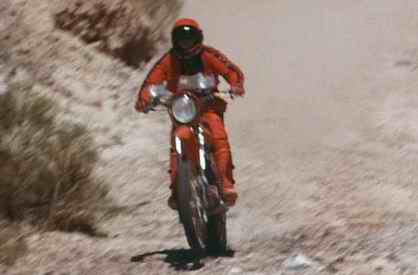 Μοιραία, ο Lyle αποκλίνει από την πορεία του και βρίσκεται δίπλα στα μηχανήματα την στιγμή ακριβώς που οι επιστήμονες έκαναν την αντίστροφη μέτρηση για το ταξίδι στο χρόνο. Έτσι, ο Lyle ντυμένος με την κατακόκκινη φόρμα των αγώνων και το κράνος του και καβαλώντας τη δίχρονη αγωνιστική μηχανή του βρίσκεται χωρίς να το ξέρει στο 1880 όπου κυριαρχούν οι πιστολάδες και οι παράνομοι.